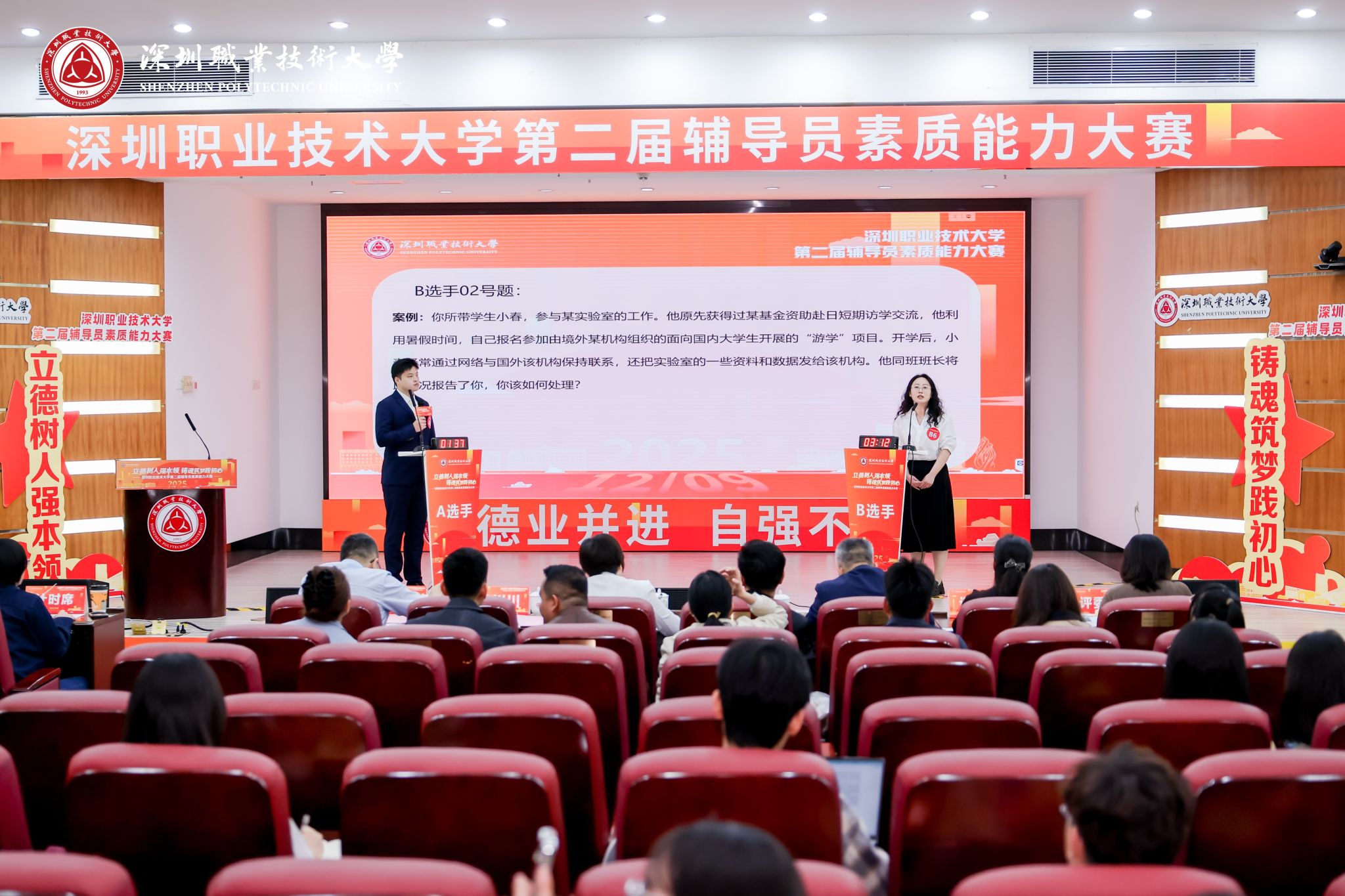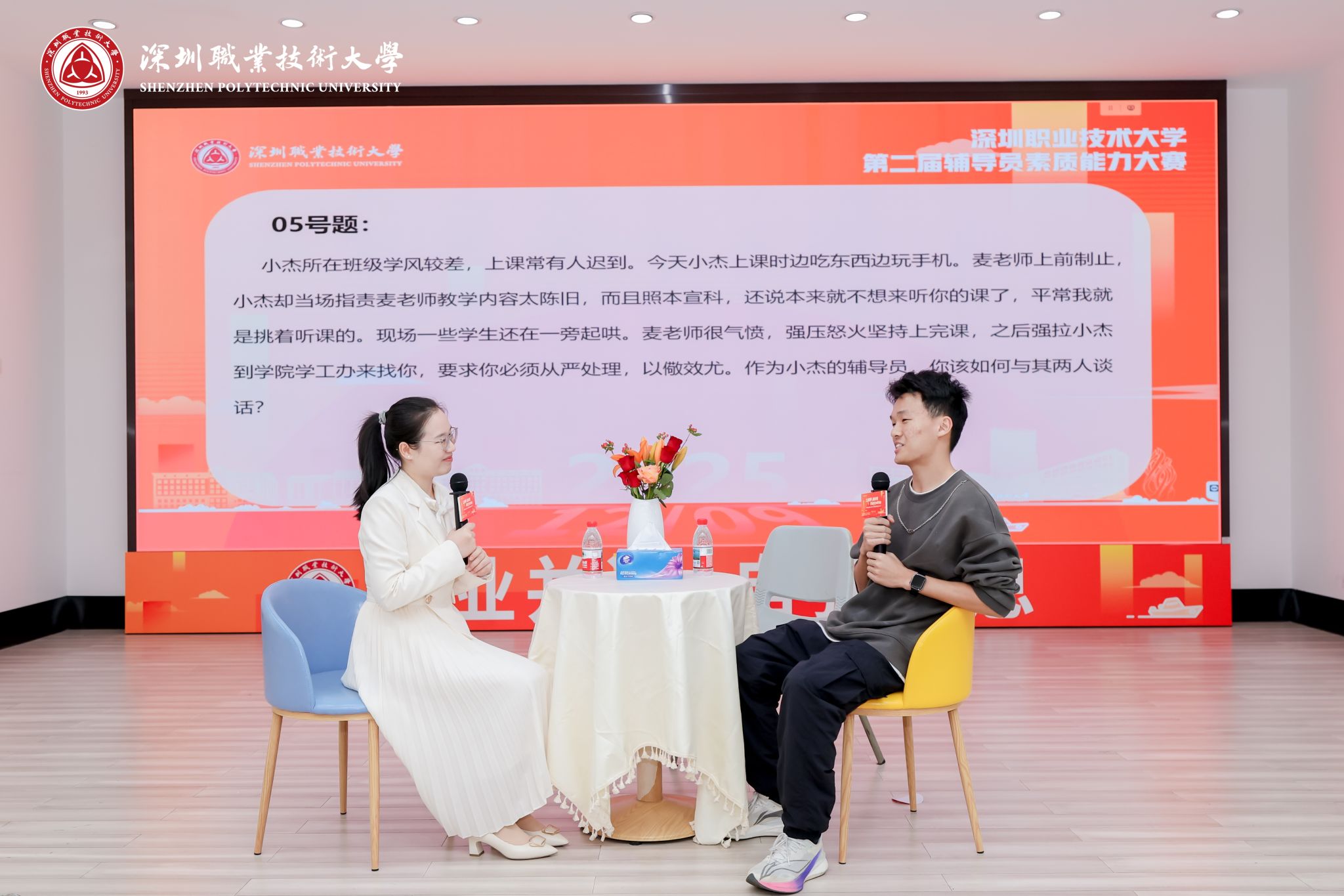 本次辅导员素质能力大赛历经初赛(基础知识测试)和决赛(案例研讨、谈心谈话),全体130余名辅导员参加初赛,结合初赛成绩排名及报名情况,14名辅导员最终晋级决赛。12月9日,深圳职业技术大学第二届辅导员素质能力大赛决赛在西丽湖园区图书馆西厅举办,党委委员、组织部部长黄川川,学生工作部部长王敏坚,学生处副处长艾尼瓦尔·阿布都热依木、黄飙,二级学院副书记代表,全体辅导员共同到场观摩。来自广州科技职业技术大学、佛山大学、惠州学院、广东轻工职业技术大学、深圳大学的学工专家担任此次大赛评委。